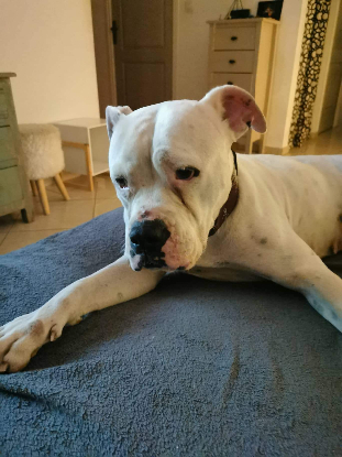 Olfy n'est pas un dogue argentin, elle ressemble plus à un boulam. Elle a été trouvée dans la rue vers la fourrière de saint André, nourrie puis sécurisée elle se montre douce, humains et congénères. Elle n'a jamais été réclamée, surement un abandon volontaire, c'est une chienne éduquée, propre, ne tire pas en laisse, elle suit sa famille d'accueil partout et attend sagement. Attention suspicion de surdité, mais elle avait des otites (soignées ) quand elle a été sécurisée. C'est toujours la même chose, on veut un chien mais on l'abandonne sans remord, en le laissant se dégrader, on ne saura jamais si elle était sourde avant les otites ou après, mais le résultat est aujourd'hui là !