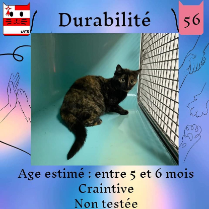 Durabilité, femelle de 5-6 mois craintive (un comportement normal en fourrière) qui vous attend dans une fourrière du 56. ATTENTION SORTIE AU PLUS TARD LE 09/12/2022 (avant euthanasie) !