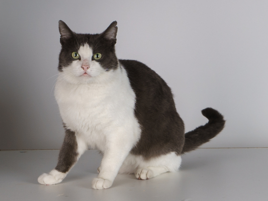 Mioumiou est un beau minou gris et blanc d'environ 6 ans. Il est très très affectueux avec les humains, il va jusqu’à se mettre debout sur ses pattes arrière pour chercher les caresses !