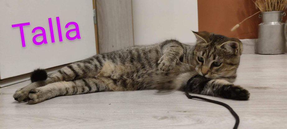 Talla est une petite minette très mignonne et douce, elle aura besoin d'une famille aussi douce qu'elle..! Elle est très joueuse, balle, petite souris ou ficelle elle adore... Elle ronronne très facilement et accepte d'être portée et câlinée d'autant plus si madame est posée sur un plaid et elle adore être gratouillée sur le ventre et lézarder au soleil !