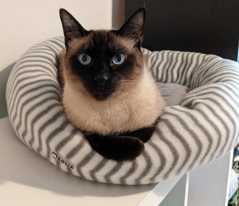 Il vient souvent miauler pour accueillir sa FA qui rentre du travail et qu’il attend impatiemment sa pâtée , ou quand il veut qu’elle lui fasse une place à ses côtés ou pour qu’elle lui ouvre la fenêtre sécurisée …