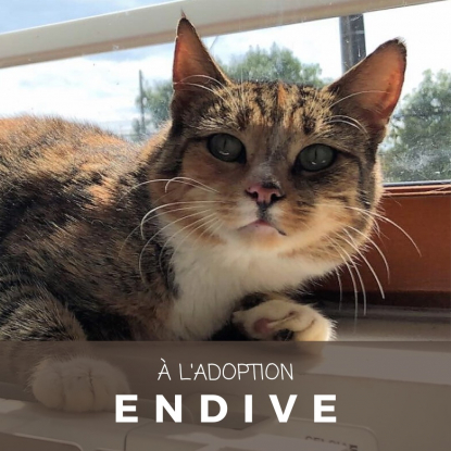 Endive a été capturée sur un site de prolifération où la majorité des chats était dans un état préoccupant. Arrivée très malade et à bout de forces à l'association, elle a du être hospitalisée en urgence et s'est battue pour s'en sortir. Très craintive, elle a eu la chance de tomber sur des anges gardiens qui ont su la sociabiliser à merveille. Aujourd'hui, son ancienne vie est bel et bien derrière elle et Endive n'attend qu'une chose : provoquer le coup de coeur et trouver sa famille pour la vie !