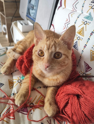 CARAMEL est né avec ses frères et sœurs (Méli, Mélo et Doucette) début Juin 2022. Leur maman était une chatte errante à Retiers qui venait manger devant la fenêtre d’une retraitée. Cette dernière a fini par l’apprivoiser (la maman était au départ très craintive) et par l’adopter. Mais avant d’avoir pu la mettre en règle, la chatte a mis bas à 4 chatons.