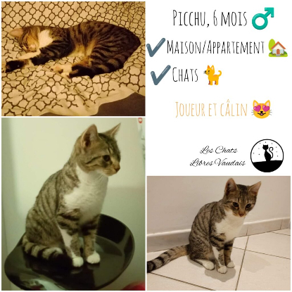 Ce tout jeune chaton est un amour Il dort beaucoup (comme tous les chats) mais en même temps il déborde d’une énergie incroyable : une boule de papier ou une ficelle et c’est un spectacle de vrilles et d’acrobaties qui valent le coup d’œil ! Il est par ailleurs très intelligent et audacieux. Picchu est un super compagnon qui vient se blottir et ronronne aux premières caresses pour finir par s’endormir paisiblement