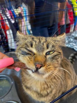 nous l’avons sauvé de la rue et d’une mort certaine car comme vous le voyez il lui manque un œil et il a faillit s’infecter.