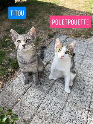 POUETPOUETTE est une petite femelle estimée à 9mois. Très très caline, elle adore se frotter aux jambes et demande pleins de caresses. Elle vient même en courant quand on l’appelle ! Très douce même pendant les jeux, c’est un amour ! Elle fait tout comme son frère Titou, avec qui elle est fusionnelle (câlins, toilettage, jeux).