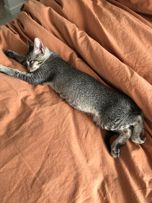 « Lipton est un chaton plutôt réservé (une petite crevette), à qui il faudra laisser un peu de temps pour qu'il prenne confiance, car c'est vraiment une petite crème qui aura besoin de beaucoup d'amour. Il n'hésite cependant pas à venir se poser sur moi pour un câlin. Un chat très sympa avec lui serait l'idéal, car il adore vraiment leur compagnie. »