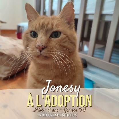 Une fois bien détendu dans sa maison d'accueil, Jonesy a pu faire la rencontre de 2 chats et d'un petit chien, et la cohabitation se fait très bien. Il pourra donc intégrer une famille pour la vie ayant déjà des animaux. Les jeunes enfants peuvent être un peu brusques pour lui car il aime décider quand il préfère être tranquille, et quand il veut des câlins. Jonesy recherche un douce famille pour prendre soin de lui, en maison sans accès à l'extérieur ou en appartement, avec ou sans autres animaux.