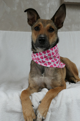 Lady a été trouvée abandonnée loin de tout sur l'ile de La Réunion. Elle est âgée d'un an et pèse 16 kilos (taille moyenne).