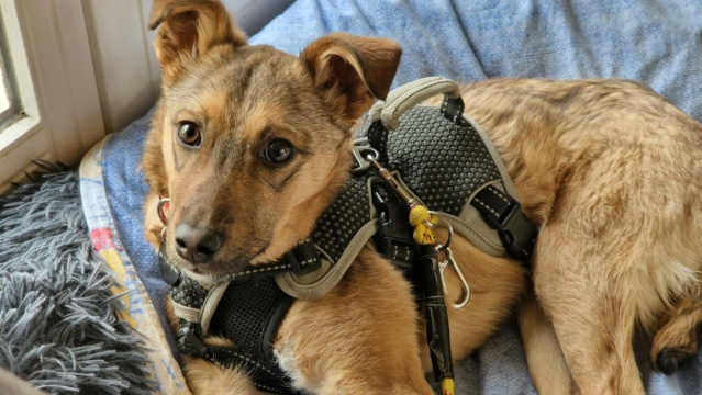 Elle est propre. La marche en laisse et la solitude sont en cours d'apprentissage.
