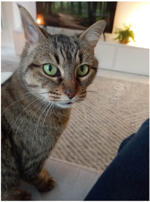 Du haut de ses 13 ans, elle se montre câline, pot de colle et joueuse. Son jeu préféré, c'est quand on agite un ruban de paquet cadeau. Elle se met à courir après comme un chaton. Elle est douce et aimante, elle adore son herbe à chat !