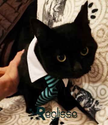 REGLISSE est un chat très câlin et mignon. Il se laisse porter dans les bras, il a encore un côté peureux du fait de son passé. Il a beaucoup évolué au sein de sa famille d'accueil. C'est un bon gourmand qui aime beaucoup la pâté, le poulet rôti. REGLISSE fera le bonheur des petits et des grands.