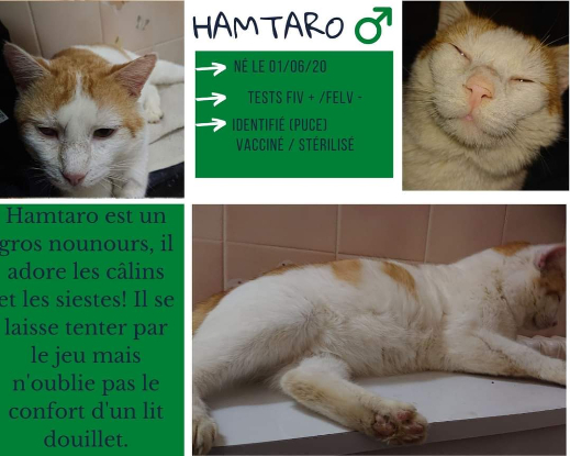 FIV+, Hamtaro est en bonne santé, il pourra être accueilli en famille d'accueil longue durée (les frais vétérinaires restent à la charge de l'association)