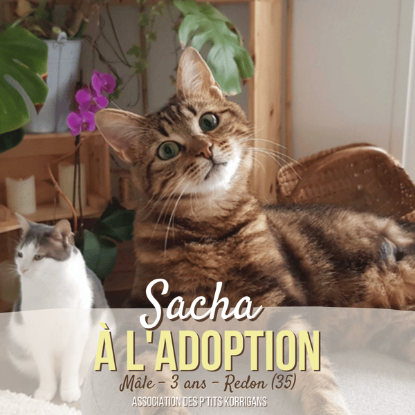 Sacha a besoin d'un autre chat pour s'épanouir : ses adoptants devront avoir déjà au moins un autre chat. Au début, il sera peut-être peureux car l'adoption sera un gros changement. Il faudra que ses adoptants soient patients pour créer une relation avec lui, le temps qu'il s'adapte et se détende dans son nouvel environnement.