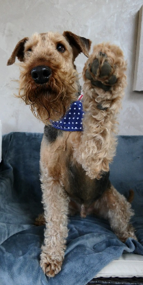 Lemon est un mâle Airedale né le 26 juin 2015. Sa maîtresse encore jeune, ne sortira malheureusement pas de l’hôpital dans lequel elle est hospitalisée.... Elle m'avait contactée il y a deux ans à ce sujet pour préparer l'avenir de Lenon. Je lui avais promis que je me chargerai de lui trouver une nouvelle famille.