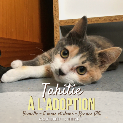 Tahitie a été recueillie chatonne lorsqu'elle était à l'abandon sur un chantier en plein travaux, en pleine ville de Rennes. Sa bienfaitrice l'a attrapée (elle était alors très peureuse et ne se laissait pas approcher), soignée et accompagnée pour qu'elle prenne confiance envers les humains.