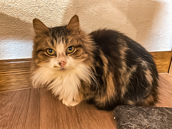 Myosotis a le poil long, c'est une gentille chatte qui aime les câlins et est assez vite en confiance avec l'humain malgré le fait qu'elle était sauvage.