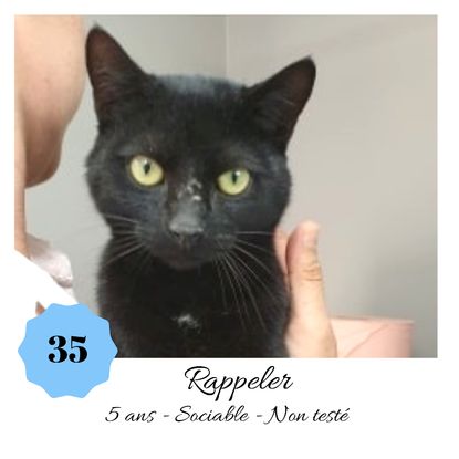 URGENCE EUTHANASIE ! Rappeler est une magnifique perle noire sociable de 5 ans qui vous attend dans une fourrière du 35. ATTENTION SORTIE AU PLUS TARD LE 06/09/2019 (avant euthanasie)! Pour adopter, c'est facile : ➡️ On se rend sur la page facebook d'Urgence Fourrière de Bretagne (UFB) -> https://www.facebook.com/sosfourrieresbreizh/ ➡️ On vient en message privé sur la page UFB ➡️ On remplit le questionnaire ➡️ Si le questionnaire est validé, on se rend disponible pour la pré-visite ➡️ On se rend aussi disponible pour venir chercher le loulou en fourrière Les chats sortent de fourrière primo-vaccinés et identifiés. Restera à charge de l’adoptant le rappel de vaccin et la stérilisation qui est OBLIGATOIRE. ---- A PROPOS D'URGENCE FOURRIERE DE BRETAGNE (UFB) Nous sommes un COLLECTIF d'ASSOCIATIONS DE PROTECTION ANIMALE (qui rassemble notamment Moustaches et Compagnie, Bêtes de Scène, les Pachas, Chats Libres de Berné, etc, etc....) Le BUT de ce collectif d'associations est donc de SORTIR ces animaux des fourrières surchargées en les faisant ADOPTER de manière LEGALE par des familles ou en leur trouvant des FAMILLES D'ACCUEIL lorsque des places en association se libèrent.