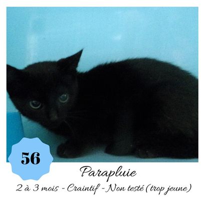 URGENCE EUTHANASIE ! Parapluie est un chaton de 2-3 mois craintif (en situation de fourrière) qui recherche une famille patiente pour le mettre à l'aise. Il vous attend dans une fourrière du 56. ATTENTION SORTIE AU PLUS TARD LE 13/09/2019 (avant euthanasie)! Pour adopter, c'est facile : ➡️ On se rend sur la page facebook d'Urgence Fourrière de Bretagne (UFB) -> https://www.facebook.com/sosfourrieresbreizh/ ➡️ On vient en message privé sur la page UFB ➡️ On remplit le questionnaire ➡️ Si le questionnaire est validé, on se rend disponible pour la pré-visite ➡️ On se rend aussi disponible pour venir chercher le loulou en fourrière Les chats sortent de fourrière primo-vaccinés et identifiés. Restera à charge de l’adoptant le rappel de vaccin et la stérilisation qui est OBLIGATOIRE. ---- A PROPOS D'URGENCE FOURRIERE DE BRETAGNE (UFB) Nous sommes un COLLECTIF d'ASSOCIATIONS DE PROTECTION ANIMALE (qui rassemble notamment Moustaches et Compagnie, Bêtes de Scène, les Pachas, Chats Libres de Berné, etc, etc....) Le BUT de ce collectif d'associations est donc de SORTIR ces animaux des fourrières surchargées en les faisant ADOPTER de manière LEGALE par des familles ou en leur trouvant des FAMILLES D'ACCUEIL lorsque des places en association se libèrent.