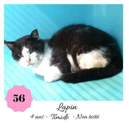 URGENCE EUTHANASIE ! Lapin est une jolie minette de 4 ans sauvage ( en situation de fourrière) qui vous attend dans une fourrière du 56. ATTENTION SORTIE AU PLUS TARD LE 13/09/2019 (avant euthanasie)! Pour adopter, c'est facile : ➡️ On se rend sur la page facebook d'Urgence Fourrière de Bretagne (UFB) -> https://www.facebook.com/sosfourrieresbreizh/ ➡️ On vient en message privé sur la page UFB ➡️ On remplit le questionnaire ➡️ Si le questionnaire est validé, on se rend disponible pour la pré-visite ➡️ On se rend aussi disponible pour venir chercher le loulou en fourrière Les chats sortent de fourrière primo-vaccinés et identifiés. Restera à charge de l’adoptant le rappel de vaccin et la stérilisation qui est OBLIGATOIRE. Les femelles en fourrière ayant été trouvées dans la rue, il y a fort à parier que nombre d'entre elles en âge de l'être soient gestantes ... ---- A PROPOS D'URGENCE FOURRIERE DE BRETAGNE (UFB) Nous sommes un COLLECTIF d'ASSOCIATIONS DE PROTECTION ANIMALE (qui rassemble notamment Moustaches et Compagnie, Bêtes de Scène, les Pachas, Chats Libres de Berné, etc, etc....) Le BUT de ce collectif d'associations est donc de SORTIR ces animaux des fourrières surchargées en les faisant ADOPTER de manière LEGALE par des familles ou en leur trouvant des FAMILLES D'ACCUEIL lorsque des places en association se libèrent.