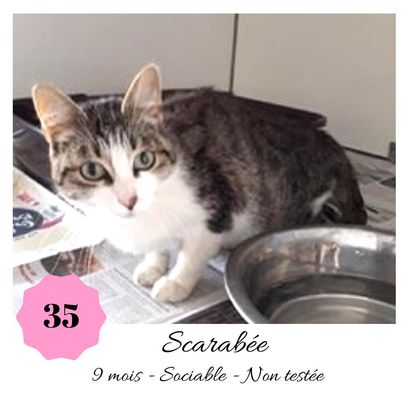URGENCE EUTHANASIE ! Scarabée est une jolie minette de 9 mois sociable qui vous attend dans une fourrière du 35. ATTENTION SORTIE AU PLUS TARD LE 13/09/2019 (avant euthanasie)! Pour adopter, c'est facile : ➡️ On se rend sur la page facebook d'Urgence Fourrière de Bretagne (UFB) -> https://www.facebook.com/sosfourrieresbreizh/ ➡️ On vient en message privé sur la page UFB ➡️ On remplit le questionnaire ➡️ Si le questionnaire est validé, on se rend disponible pour la pré-visite ➡️ On se rend aussi disponible pour venir chercher le loulou en fourrière Les chats sortent de fourrière primo-vaccinés et identifiés. Restera à charge de l’adoptant le rappel de vaccin et la stérilisation qui est OBLIGATOIRE. Les femelles en fourrière ayant été trouvées dans la rue, il y a fort à parier que nombre d'entre elles en âge de l'être soient gestantes ... ---- A PROPOS D'URGENCE FOURRIERE DE BRETAGNE (UFB) Nous sommes un COLLECTIF d'ASSOCIATIONS DE PROTECTION ANIMALE (qui rassemble notamment Moustaches et Compagnie, Bêtes de Scène, les Pachas, Chats Libres de Berné, etc, etc....) Le BUT de ce collectif d'associations est donc de SORTIR ces animaux des fourrières surchargées en les faisant ADOPTER de manière LEGALE par des familles ou en leur trouvant des FAMILLES D'ACCUEIL lorsque des places en association se libèrent.