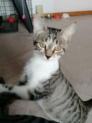 Papouille a 4 mois et se trouve en famille d'accueil avec d'autres chatons. Il est très tactile et vient réclamer le contact passée la période de méfiance. Il est un peu dominant avec ses congénères