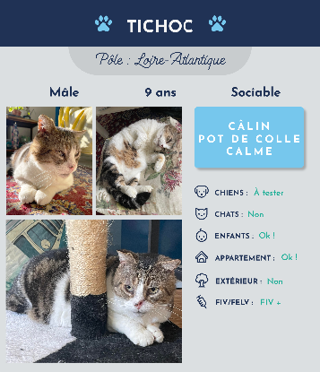 Petite précision, je suis un chat malade de FIV, et j’ai eu un passif compliqué, parfois un peu bagarreur avec d’autres chats, je ne peux donc pas être en contact avec mes congénères ; pour leur santé et ma sécurité.