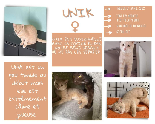 Testée felv+, Unik est en bonne santé, elle pourra être accueillie en famille d'accueil (les frais vétérinaires restent à la charge de l'association)