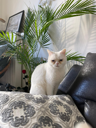 Tout blanc avec de grands yeux bleus, il est la crème de la crème. Gentil ++++, il adore être près de vous, ronrons à tout va, câlins, re-câlins, re-re-câlins... Mais il aime aussi beaucoup jouer et ce toujours avec douceur.