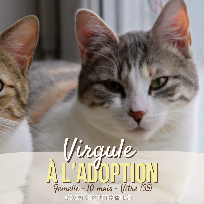 Son histoire : Virgule est née sur un site de prolifération dans les côtes d'armor. Sur ce site, il y a une chatte de 7 ans qui a fait des portées toute sa vie... et qui a enfin été stérilisée par la personne qui souhaite la garder avec elle suite à la sensibilisation par l'association. Sur place quand nous sommes arrivés il y avait 4 chatons (la portée de voyelle) et 5 adultes. 2 d es adultes ont été pris en charge en janvier : Pedro & Chico. Il reste 3 adultes (2 femelle et 1 mâles) à sortir de cette endroit, l'association leur cherche activement des solutions. Pour un endroit où il y a eu des portées pendant 7 ans, avec des chats qui ont tous moins de 2 ans sur place, sauf leur mère... nous suspectons de nombreux décès au fil des années : c'est aussi et surtout ça, la vie des chats dehors...