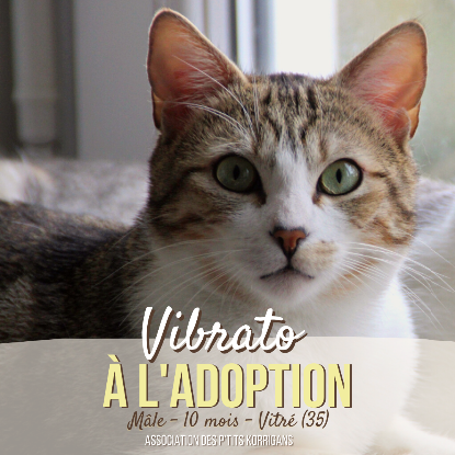 Vibrato est un petit chat câlin, joueur et ronronneur. Une vraie patte qui se laisse prendre dans les bras et bisouiller. C'est une boule de tendresse et aussi un grand bavard qui aime miauler et roucouler. Au premier abord il est assez trouillard et aura besoin de patience pour créer un lien avec ses adoptants. Il peut rester un peu flippé quand il ne connaît pas les personnes ou les situations, ce n'est pas un chat téméraire qui fonce, mais plutôt un chat prudent qui tâte le terrain et prend son temps avant de se lancer. Il est très proche de sa sœur Virgule et recherche une famille qui les adoptera ensemble.