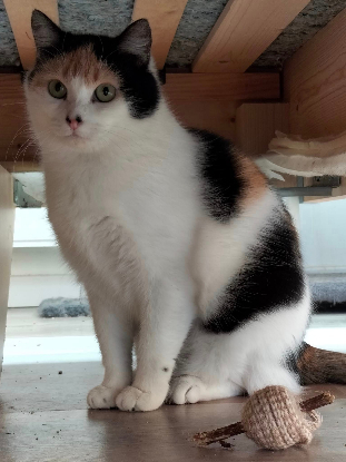 Mon nom est Pourpre. Evidemment, il ne correspond pas à mon pelage mais plutôt à mon tempérament… Je suis une jolie femelle tricolore qui a été recueillie par l’association avec beaucoup d’autres chats derrière un magasin.