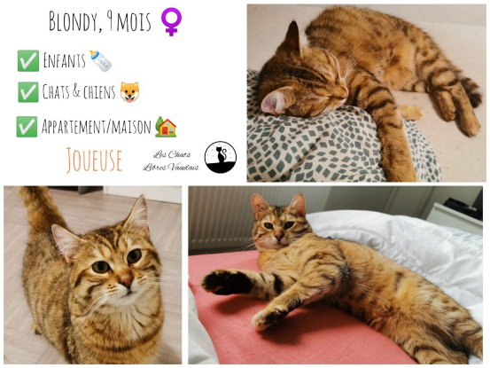 Avec ses jolies couleurs et ses belles prunelles, Blondy ne manque jamais de séduire humain, chat et même chien Très sociable, elle adore la présence des enfants, des chats, et de son ami chien en famille d’accueil