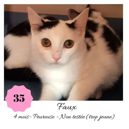 URGENCE EUTHANASIE ! Faux est une jolie minette de 4 mois sociable qui vous attend dans une fourrière du 35. ATTENTION SORTIE AU PLUS TARD LE 21/09/2019 (avant euthanasie)! Pour adopter, c'est facile : ➡️ On se rend sur la page facebook d'Urgence Fourrière de Bretagne (UFB) -> https://www.facebook.com/sosfourrieresbreizh/ ➡️ On vient en message privé sur la page UFB ➡️ On remplit le questionnaire ➡️ Si le questionnaire est validé, on se rend disponible pour la pré-visite ➡️ On se rend aussi disponible pour venir chercher le loulou en fourrière Les chats sortent de fourrière primo-vaccinés et identifiés. Restera à charge de l’adoptant le rappel de vaccin et la stérilisation qui est OBLIGATOIRE. Les femelles en fourrière ayant été trouvées dans la rue, il y a fort à parier que nombre d'entre elles en âge de l'être soient gestantes ... ---- A PROPOS D'URGENCE FOURRIERE DE BRETAGNE (UFB) Nous sommes un COLLECTIF d'ASSOCIATIONS DE PROTECTION ANIMALE (qui rassemble notamment Moustaches et Compagnie, Bêtes de Scène, les Pachas, Chats Libres de Berné, etc, etc....) Le BUT de ce collectif d'associations est donc de SORTIR ces animaux des fourrières surchargées en les faisant ADOPTER de manière LEGALE par des familles ou en leur trouvant des FAMILLES D'ACCUEIL lorsque des places en association se libèrent.