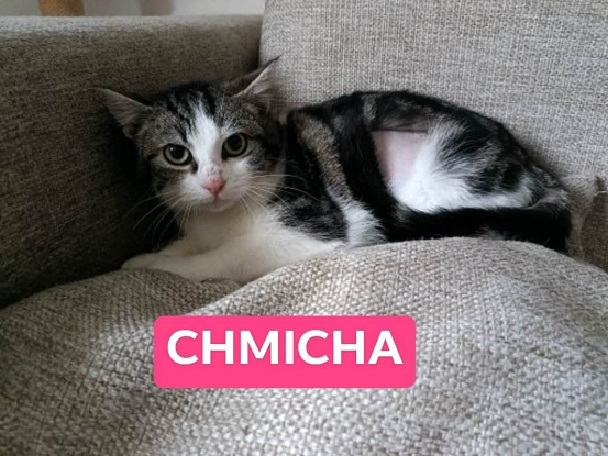 CHMICHA petite chatonne de 6mois. Reste assez sur la réserve avec les humains qu'elle apprend à découvrir. Elle commence à se laisser caresser et prendre dans les bras pour des bisous. Il ne manque pas grand chose pour qu'elle se laisse aller a être parfaitement à l'aise.