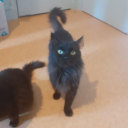Mistigrou, joli chat noir aux poils longs, d'environ 5 ans et demi.