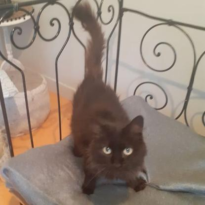 Mistinguette, jolie minette noire aux poils longs, d'environ 5 ans et demi.