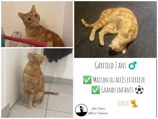 Pour Garfield, nous lui cherchons absolument une famille ayant un accès extérieur, maison ou rez-de-jardin. Il réclamera à sortir faire des balades, et ne part jamais bien loin de sa maison. Mais cela est important pour son bonheur