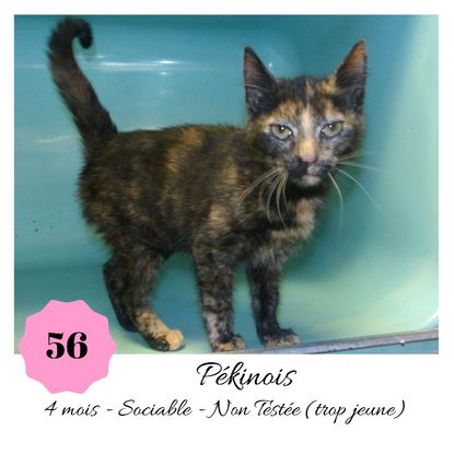 URGENCE EUTHANASIE ! Pékinois est une jolie minette de 4 mois sociable qui vous attend dans une fourrière du 56. ATTENTION SORTIE AU PLUS TARD LE 27/09/2019 (avant euthanasie)! Pour adopter, c'est facile : ➡️ On se rend sur la page facebook d'Urgence Fourrière de Bretagne (UFB) -> https://www.facebook.com/sosfourrieresbreizh/ ➡️ On vient en message privé sur la page UFB ➡️ On remplit le questionnaire ➡️ Si le questionnaire est validé, on se rend disponible pour la pré-visite ➡️ On se rend aussi disponible pour venir chercher le loulou en fourrière Les chats sortent de fourrière primo-vaccinés et identifiés. Restera à charge de l’adoptant le rappel de vaccin et la stérilisation qui est OBLIGATOIRE. Les femelles en fourrière ayant été trouvées dans la rue, il y a fort à parier que nombre d'entre elles en âge de l'être soient gestantes ... ---- A PROPOS D'URGENCE FOURRIERE DE BRETAGNE (UFB) Nous sommes un COLLECTIF d'ASSOCIATIONS DE PROTECTION ANIMALE (qui rassemble notamment Moustaches et Compagnie, Bêtes de Scène, les Pachas, Chats Libres de Berné, etc, etc....) Le BUT de ce collectif d'associations est donc de SORTIR ces animaux des fourrières surchargées en les faisant ADOPTER de manière LEGALE par des familles ou en leur trouvant des FAMILLES D'ACCUEIL lorsque des places en association se libèrent.