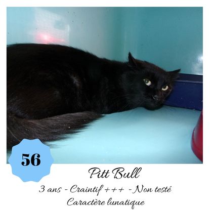 URGENCE EUTHANASIE ! Pitt Bull est un bon matou de 3 ans craintif (en situation de fourrière) qui vous attend dans une fourrière du 56. ATTENTION SORTIE AU PLUS TARD LE 27/09/2019 (avant euthanasie)! Pour adopter, c'est facile : ➡️ On se rend sur la page facebook d'Urgence Fourrière de Bretagne (UFB) -> https://www.facebook.com/sosfourrieresbreizh/ ➡️ On vient en message privé sur la page UFB ➡️ On remplit le questionnaire ➡️ Si le questionnaire est validé, on se rend disponible pour la pré-visite ➡️ On se rend aussi disponible pour venir chercher le loulou en fourrière Les chats sortent de fourrière primo-vaccinés et identifiés. Restera à charge de l’adoptant le rappel de vaccin et la stérilisation qui est OBLIGATOIRE. Les femelles en fourrière ayant été trouvées dans la rue, il y a fort à parier que nombre d'entre elles en âge de l'être soient gestantes ... ---- A PROPOS D'URGENCE FOURRIERE DE BRETAGNE (UFB) Nous sommes un COLLECTIF d'ASSOCIATIONS DE PROTECTION ANIMALE (qui rassemble notamment Moustaches et Compagnie, Bêtes de Scène, les Pachas, Chats Libres de Berné, etc, etc....) Le BUT de ce collectif d'associations est donc de SORTIR ces animaux des fourrières surchargées en les faisant ADOPTER de manière LEGALE par des familles ou en leur trouvant des FAMILLES D'ACCUEIL lorsque des places en association se libèrent.