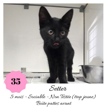 URGENCE EUTHANASIE ! Setter est une jolie minette de 5 mois sociable qui vous attend dans une fourrière du 35. ATTENTION SORTIE AU PLUS TARD LE 27/09/2019 (avant euthanasie)! Pour adopter, c'est facile : ➡️ On se rend sur la page facebook d'Urgence Fourrière de Bretagne (UFB) -> https://www.facebook.com/sosfourrieresbreizh/ ➡️ On vient en message privé sur la page UFB ➡️ On remplit le questionnaire ➡️ Si le questionnaire est validé, on se rend disponible pour la pré-visite ➡️ On se rend aussi disponible pour venir chercher le loulou en fourrière Les chats sortent de fourrière primo-vaccinés et identifiés. Restera à charge de l’adoptant le rappel de vaccin et la stérilisation qui est OBLIGATOIRE. Les femelles en fourrière ayant été trouvées dans la rue, il y a fort à parier que nombre d'entre elles en âge de l'être soient gestantes ... ---- A PROPOS D'URGENCE FOURRIERE DE BRETAGNE (UFB) Nous sommes un COLLECTIF d'ASSOCIATIONS DE PROTECTION ANIMALE (qui rassemble notamment Moustaches et Compagnie, Bêtes de Scène, les Pachas, Chats Libres de Berné, etc, etc....) Le BUT de ce collectif d'associations est donc de SORTIR ces animaux des fourrières surchargées en les faisant ADOPTER de manière LEGALE par des familles ou en leur trouvant des FAMILLES D'ACCUEIL lorsque des places en association se libèrent.