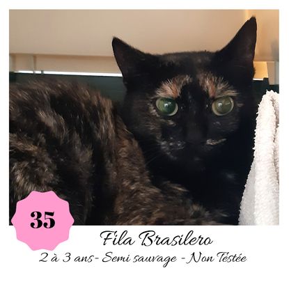 URGENCE EUTHANASIE ! Fila Brasilero est une jolie minette de 2-3 ans devenue super caline qui vous attend dans une fourrière du 35. ATTENTION SORTIE AU PLUS TARD LE 27/09/2019 (avant euthanasie)! Pour adopter, c'est facile : ➡️ On se rend sur la page facebook d'Urgence Fourrière de Bretagne (UFB) -> https://www.facebook.com/sosfourrieresbreizh/ ➡️ On vient en message privé sur la page UFB ➡️ On remplit le questionnaire ➡️ Si le questionnaire est validé, on se rend disponible pour la pré-visite ➡️ On se rend aussi disponible pour venir chercher le loulou en fourrière Les chats sortent de fourrière primo-vaccinés et identifiés. Restera à charge de l’adoptant le rappel de vaccin et la stérilisation qui est OBLIGATOIRE. Les femelles en fourrière ayant été trouvées dans la rue, il y a fort à parier que nombre d'entre elles en âge de l'être soient gestantes ... ---- A PROPOS D'URGENCE FOURRIERE DE BRETAGNE (UFB) Nous sommes un COLLECTIF d'ASSOCIATIONS DE PROTECTION ANIMALE (qui rassemble notamment Moustaches et Compagnie, Bêtes de Scène, les Pachas, Chats Libres de Berné, etc, etc....) Le BUT de ce collectif d'associations est donc de SORTIR ces animaux des fourrières surchargées en les faisant ADOPTER de manière LEGALE par des familles ou en leur trouvant des FAMILLES D'ACCUEIL lorsque des places en association se libèrent.