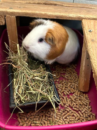 Cacahuète est une femelle cochon d'inde d'environ 6 ans. Sociable, elle se laisse porter, caresser, couper les griffes sans agressivité. Cependant elle n'est pas faite pour les enfants.
