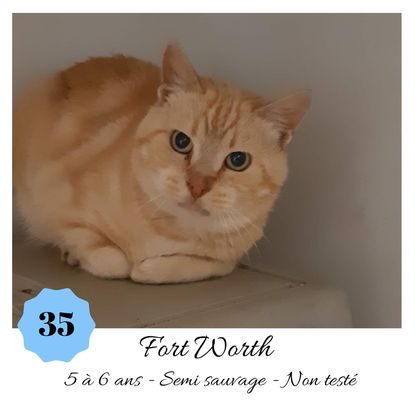 URGENCE EUTHANASIE ! Fort Worth est un matou de 5-6 ans semi sauvage (en situation de fourrière) qui vous attend dans une fourrière du 35. ATTENTION SORTIE AU PLUS TARD LE 4/10/2019 (avant euthanasie)! Pour adopter, c'est facile : ➡️ On se rend sur la page facebook d'Urgence Fourrière de Bretagne (UFB) -> https://www.facebook.com/sosfourrieresbreizh/ ➡️ On vient en message privé sur la page UFB ➡️ On remplit le questionnaire ➡️ Si le questionnaire est validé, on se rend disponible pour la pré-visite ➡️ On se rend aussi disponible pour venir chercher le loulou en fourrière Les chats sortent de fourrière primo-vaccinés et identifiés. Restera à charge de l’adoptant le rappel de vaccin et la stérilisation qui est OBLIGATOIRE. Les femelles en fourrière ayant été trouvées dans la rue, il y a fort à parier que nombre d'entre elles en âge de l'être soient gestantes ... ---- A PROPOS D'URGENCE FOURRIERE DE BRETAGNE (UFB) Nous sommes un COLLECTIF d'ASSOCIATIONS DE PROTECTION ANIMALE (qui rassemble notamment Moustaches et Compagnie, Bêtes de Scène, les Pachas, Chats Libres de Berné, etc, etc....) Le BUT de ce collectif d'associations est donc de SORTIR ces animaux des fourrières surchargées en les faisant ADOPTER de manière LEGALE par des familles ou en leur trouvant des FAMILLES D'ACCUEIL lorsque des places en association se libèrent.