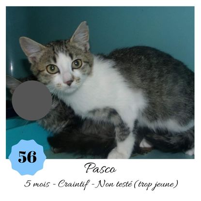 URGENCE EUTHANASIE ! Pasco est un matou de 5 mois craintif (en situation de fourrière) qui vous attend dans une fourrière du 56. ATTENTION SORTIE AU PLUS TARD LE 4/10/2019 (avant euthanasie)! Pour adopter, c'est facile : ➡️ On se rend sur la page facebook d'Urgence Fourrière de Bretagne (UFB) -> https://www.facebook.com/sosfourrieresbreizh/ ➡️ On vient en message privé sur la page UFB ➡️ On remplit le questionnaire ➡️ Si le questionnaire est validé, on se rend disponible pour la pré-visite ➡️ On se rend aussi disponible pour venir chercher le loulou en fourrière Les chats sortent de fourrière primo-vaccinés et identifiés. Restera à charge de l’adoptant le rappel de vaccin et la stérilisation qui est OBLIGATOIRE. Les femelles en fourrière ayant été trouvées dans la rue, il y a fort à parier que nombre d'entre elles en âge de l'être soient gestantes ... ---- A PROPOS D'URGENCE FOURRIERE DE BRETAGNE (UFB) Nous sommes un COLLECTIF d'ASSOCIATIONS DE PROTECTION ANIMALE (qui rassemble notamment Moustaches et Compagnie, Bêtes de Scène, les Pachas, Chats Libres de Berné, etc, etc....) Le BUT de ce collectif d'associations est donc de SORTIR ces animaux des fourrières surchargées en les faisant ADOPTER de manière LEGALE par des familles ou en leur trouvant des FAMILLES D'ACCUEIL lorsque des places en association se libèrent.