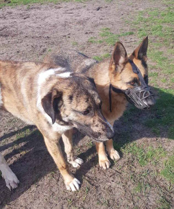 Elle ne s’entendait pas avec les chiens mais le croisement en laisse se passe bien. Elle a fait beaucoup de progrès et maintenant, elle tolère les chiens et joue avec certains (mâles et femelles), sous contrôle et avec muselière.