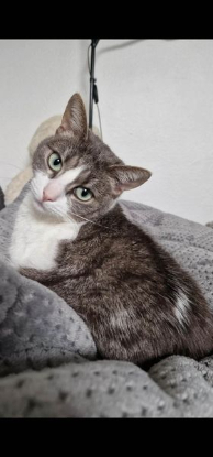 Chat femelle, type Européen, coloris Tigrée grise et blanche. Née le 23 avril 2021