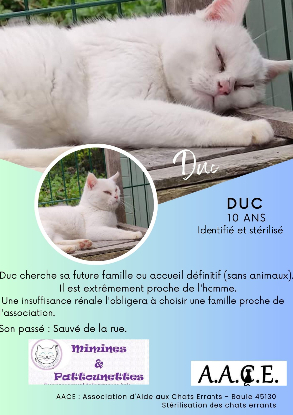 Il est extrêmement proche de l'homme, une insuffisance rénale l'obligera à choisir une famille proche de l'association pour son suivi vétérinaire