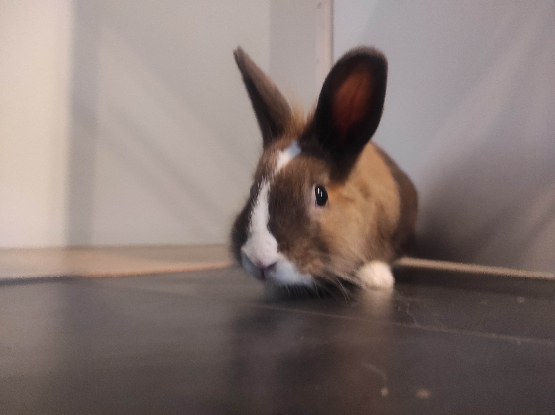 Comportement : Timimoun est un jeune lapin indépendant et curieux. Il aime beaucoup explorer, découvrir, saute facilement sur les lits/arbres a chat/ fauteuil. Il dort souvent en hauteur. Il est sociable avec l’homme et les autres animaux mais n’est pas un grand fan des câlins. Par contre il peut lui arriver de faire une ou deux léchouilles pour marquer son contentement ! C’est un grand gourmand et il est toujours présent quand c’est l’heure de la gamelle. Attention si vous êtes en retard, il ne vous lâchera pas ^^. C’est un vieux garçon dans un corps de jeune lapin. Il a ses petites habitudes, ses coins pour la sieste et aime bien que chaque chose soit à sa place. Il est propre et ne fais pas de bêtises hormis quelques câbles laissés à sa porté. C’est un lapin facile à vivre et très attachant quand on connait les lapins. Il n’y aucun doute qu’il continuera ses progrès dans un environnement calme.