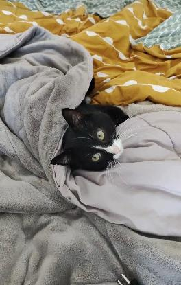 Boots est un grand chat avec de bonnes joues ! Craintif au début et avec les personnes qu'il ne connait pas, il apprécie pourtant beaucoup la compagnie. Il aimera beaucoup faire ses siestes contre vous et ne refusera pas des câlins même s'il aime aussi avoir ses temps seuls. Joueur et agile, il lui faudra quelques jouets ainsi qu'un arbre à chat car il aime bien faire ses griffes et quelques ascensions.